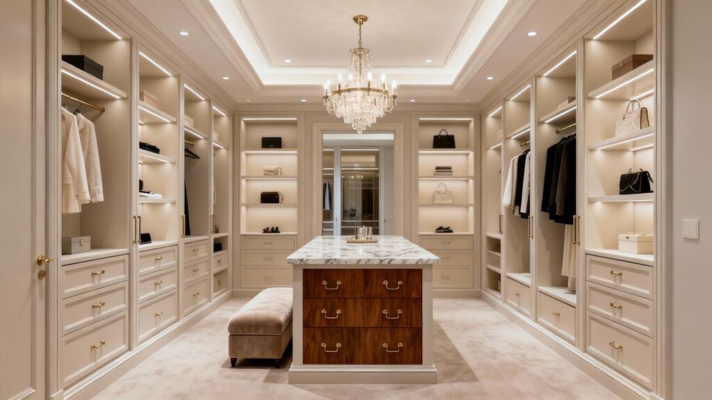 - Storage: The island itself holds custom drawers for accessories like watches, ties, and jewelry. Surrounding walls feature glass-front cabinets for display, lots of hanging space, and dedicated shoe shelving.